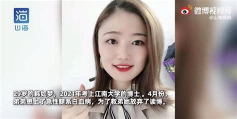 29岁的韩如梦在江南大学硕士毕业后,又考上了同校的博士,当时的她非常高兴。11月24日,韩如梦的弟弟因为早产,一出生就在医院的保温箱里度过半个月,6岁时又患上了流行性脑膜炎。韩如梦称,自己比弟弟幸运,弟弟一生受了很大的罪,三次历...